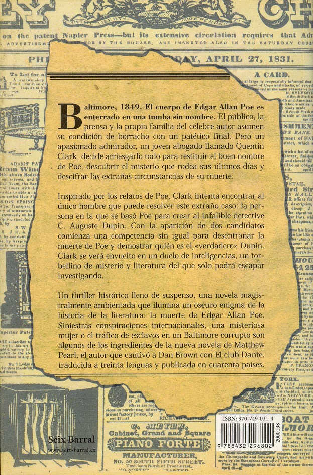 Matthew Pearl (Nueva York, octubre 2 de 1975), autor de la novela El club Dante (Seix Barral, 2004), prologó La trilogía Dupin (Seix Barral, 2006), libro que reúne los cuentos policiales del norteamericano Edgar Allan Poe (1809-1849) protagonizados por el “genio de la raciocinación” chevalier C. Auguste Dupin, debido al sonoro hecho de que urdió la novela La sombra de Poe (Seix Barral, 2006), la cual inicia con una supuesta “Nota del editor” que dice a la letra: “El misterio relacionado con la muerte de Poe en 1849 queda resuelto en estas páginas.”
